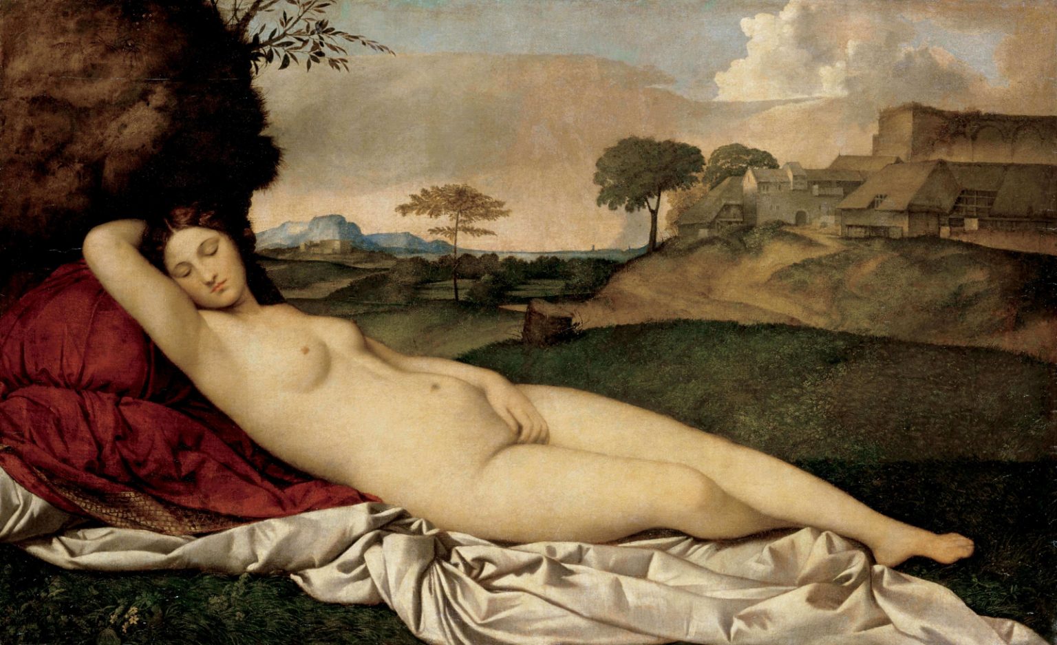 La obra presenta la figura serena de una mujer desnuda, integrada en un entorno natural de gran belleza. El paisaje que la rodea recuerda los perfiles suaves del Véneto, esa región continental que abraza a Venecia en el noreste italiano. Las colinas onduladas parecen mimetizarse con las formas delicadas del cuerpo femenino, generando una sintonía visual que invita tanto al deleite estético como a la introspección. Este escenario también remite a la Arcadia clásica, ese rincón mítico del Peloponeso que los artistas del Renacimiento idealizaban como símbolo de pureza rural y tranquilidad bucólica. En esta pintura, Giorgione logra fusionar la geografía veneciana con la nostalgia de un paraíso perdido, creando una atmósfera que es a la vez terrenal y soñada..